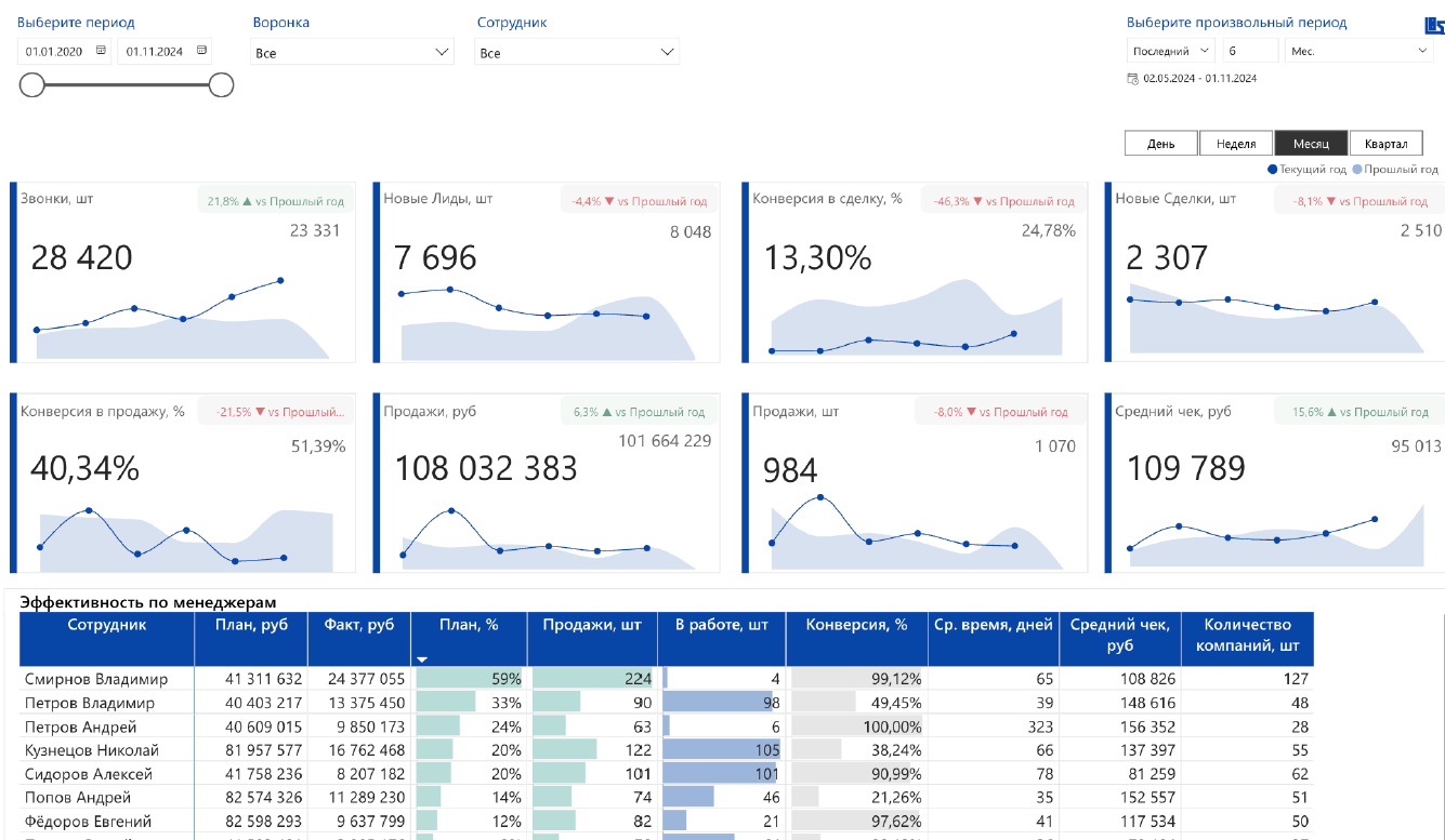 • Обзор ключевых показателей: звонки, новые лиды, конверсия, продажи, средний чек