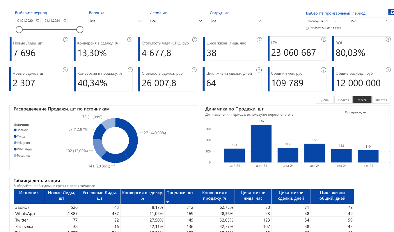 • Диаграммы для анализа по источникам, конверсиям и продажам