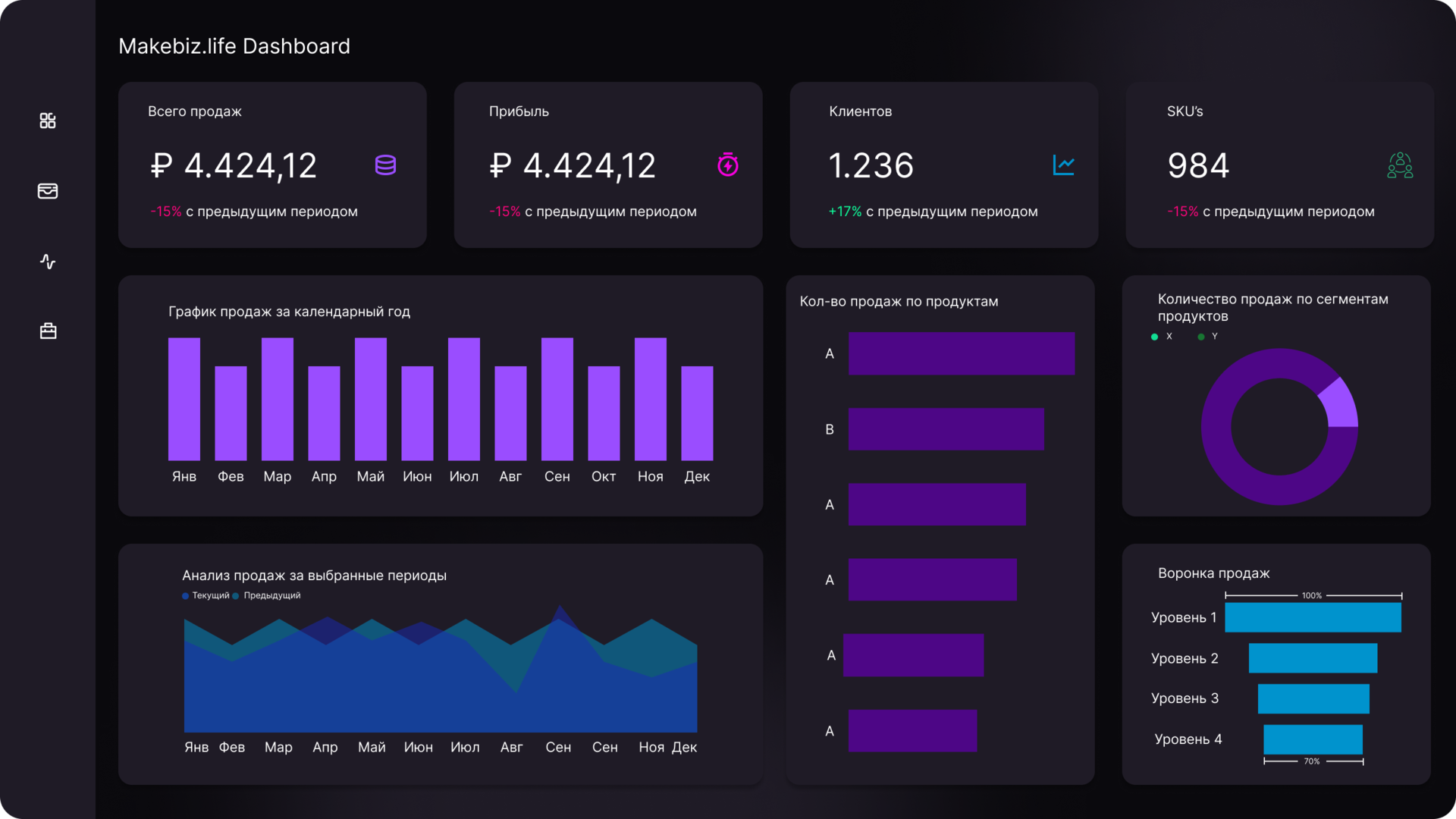 Актуальная и полная аналитика по всей компании Автоматический сбор данных из всех программ в виде понятных дашбордов, связанных с финансовой аналитикой.